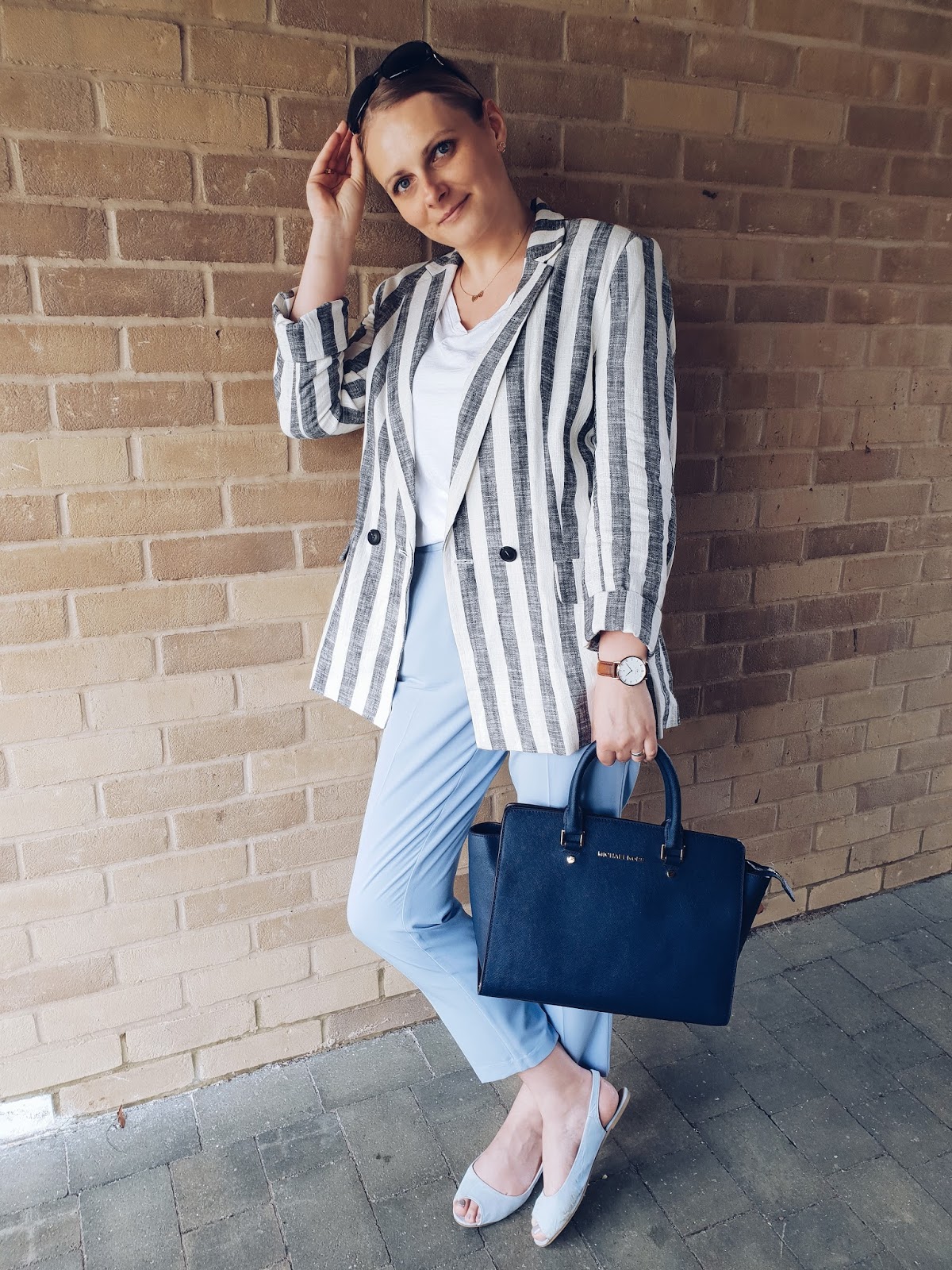 W takie dni zawsze sięgam po cygaretki, które fasonem są nieco krótsze niż zwykłe spodnie więc nie zakrywają całych nóg ale także cieńsze od jeansu. Najprościej założyć do nich zwykły biały t-shirt, który zawsze będzie dobrze wyglądał. Za to nieco niższa temperatura rankiem to okazja do założenia lekkiej lnianej marynarki w bardzo letni pasiasty wzór.