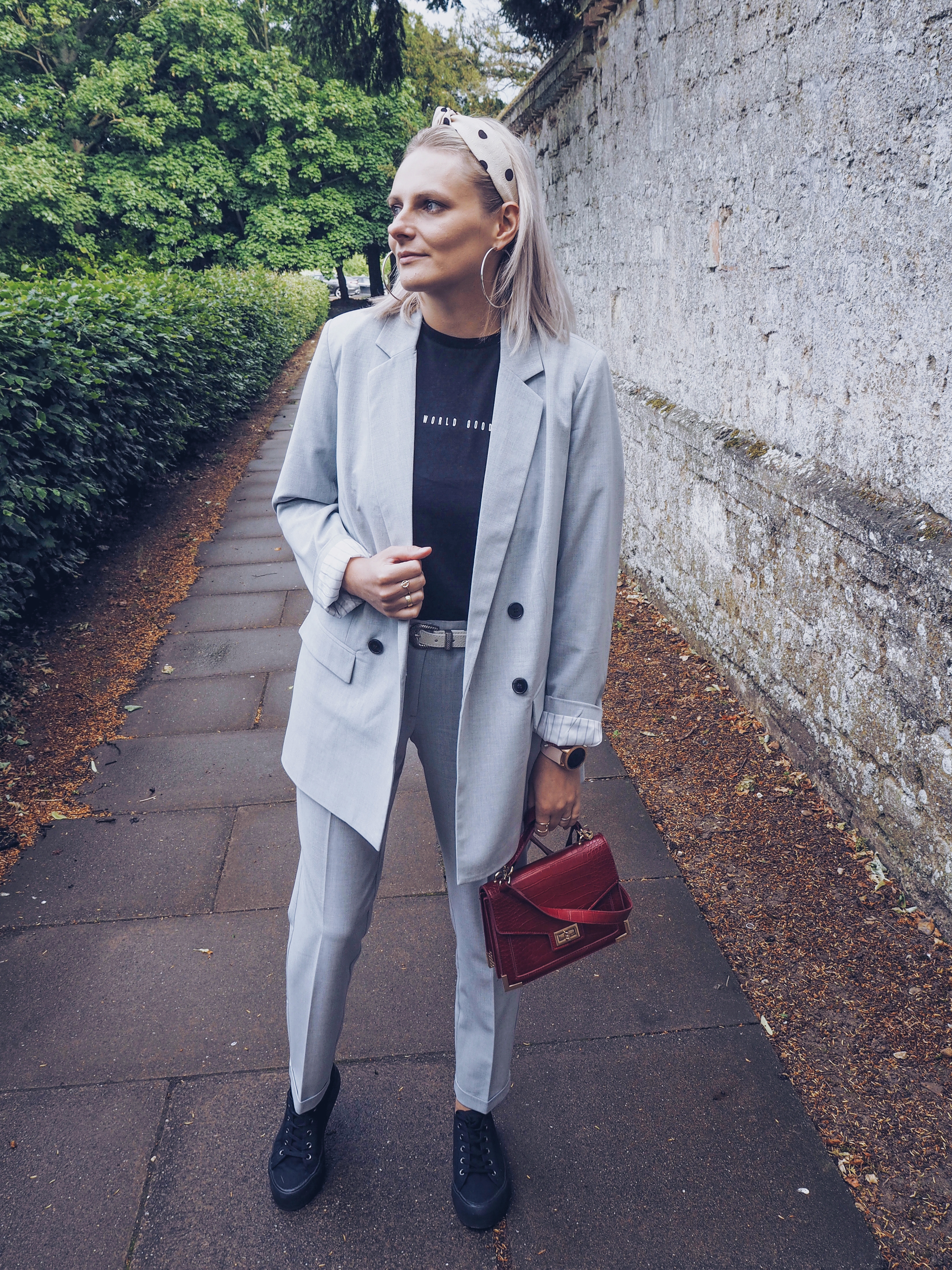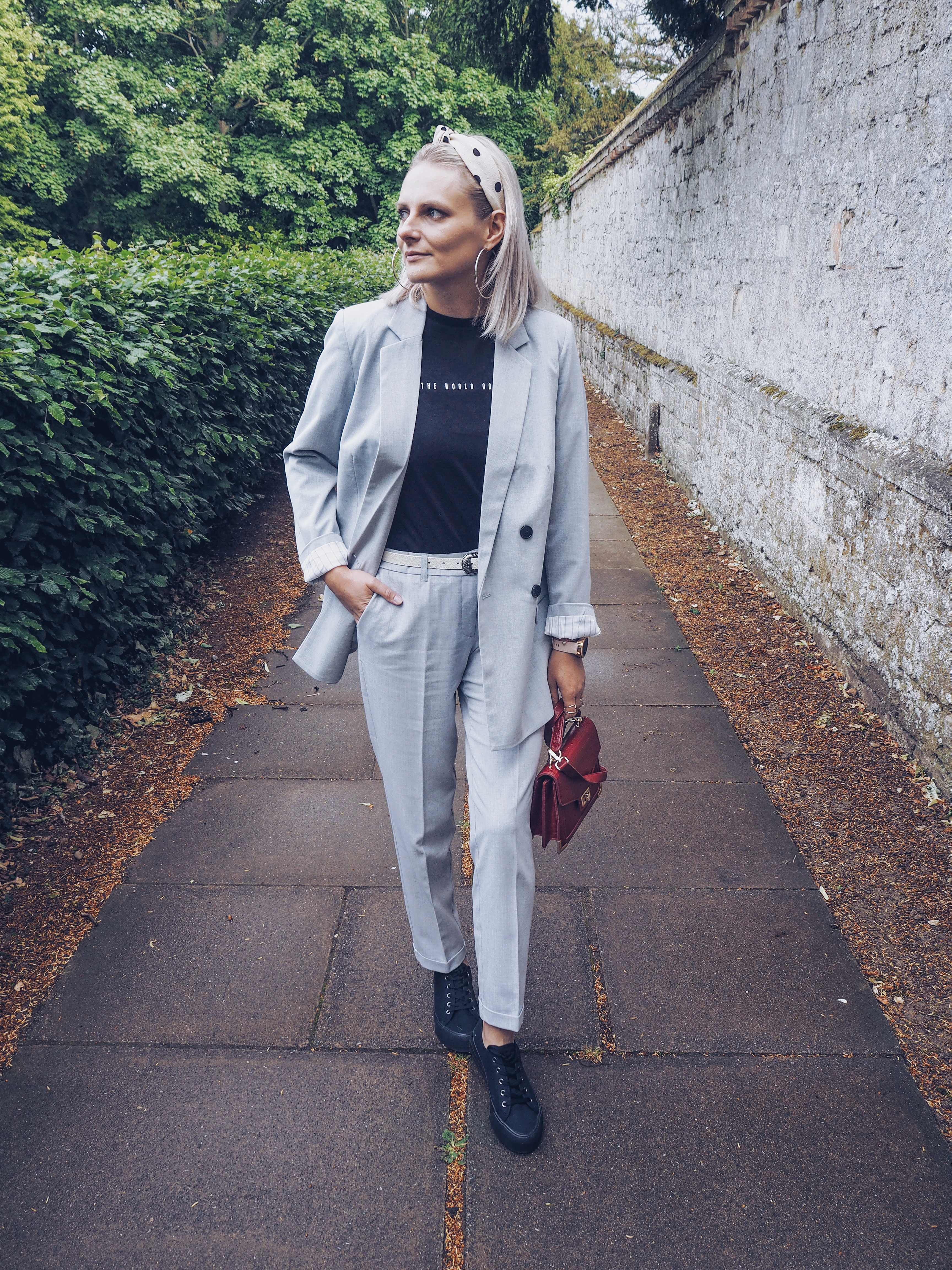 Piękny odcień szarości w teksturą "shark skin" czyli "skóra rekina", gdzie z bliska łatwo zauważyć dwa różne odcienie przeplatających się ze sobą nici. Długa oversizowa dwurzędowa marynarka i klasyczne proste spodnie o "pełnej" długości.