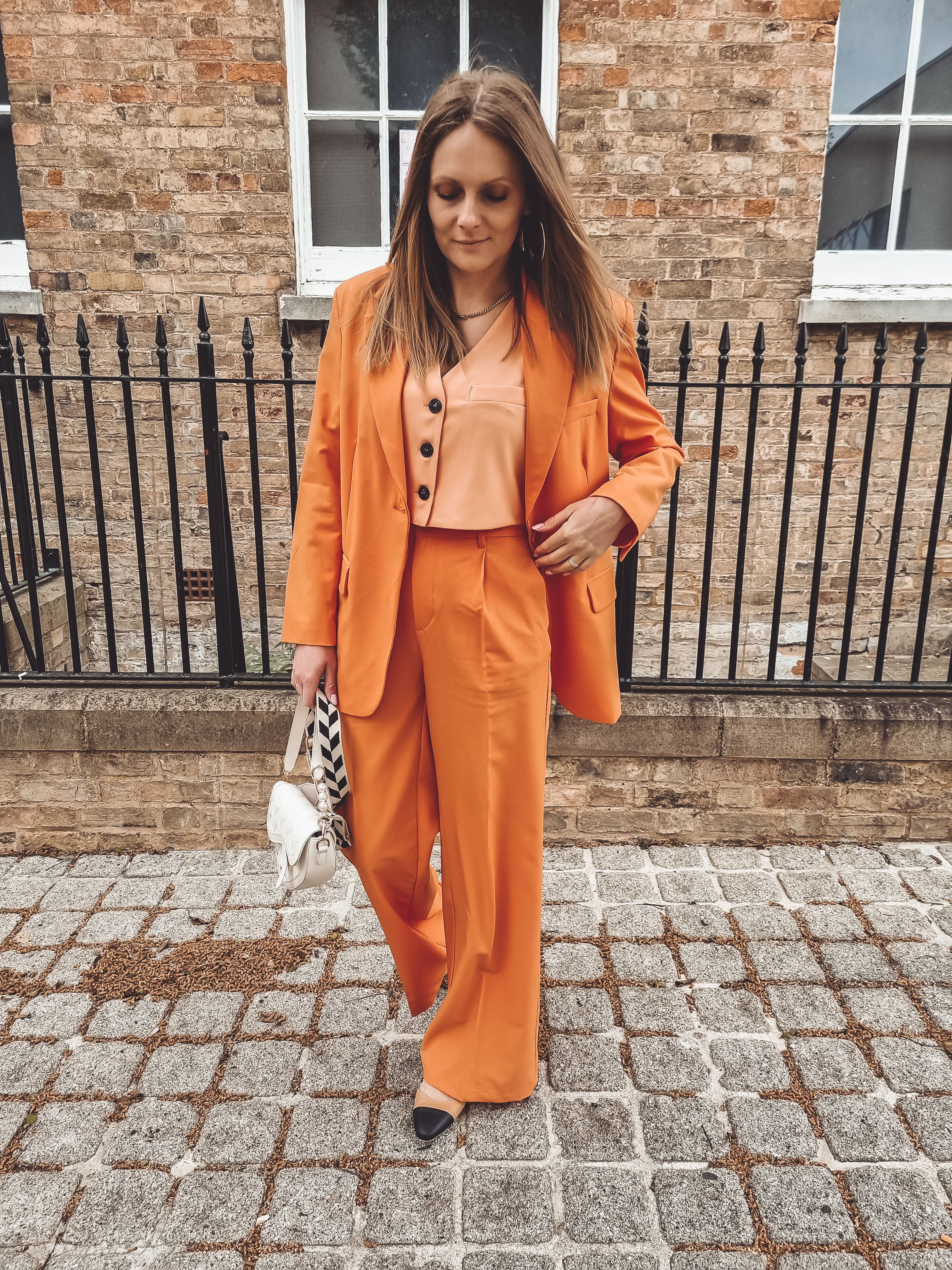 Zamiast klasycznej formy topu założyłam krótką kamizelkę w jaśniejszym odcieniu brzoskwini. Niski słupek zamiast szpilek. Tym razem ;-)