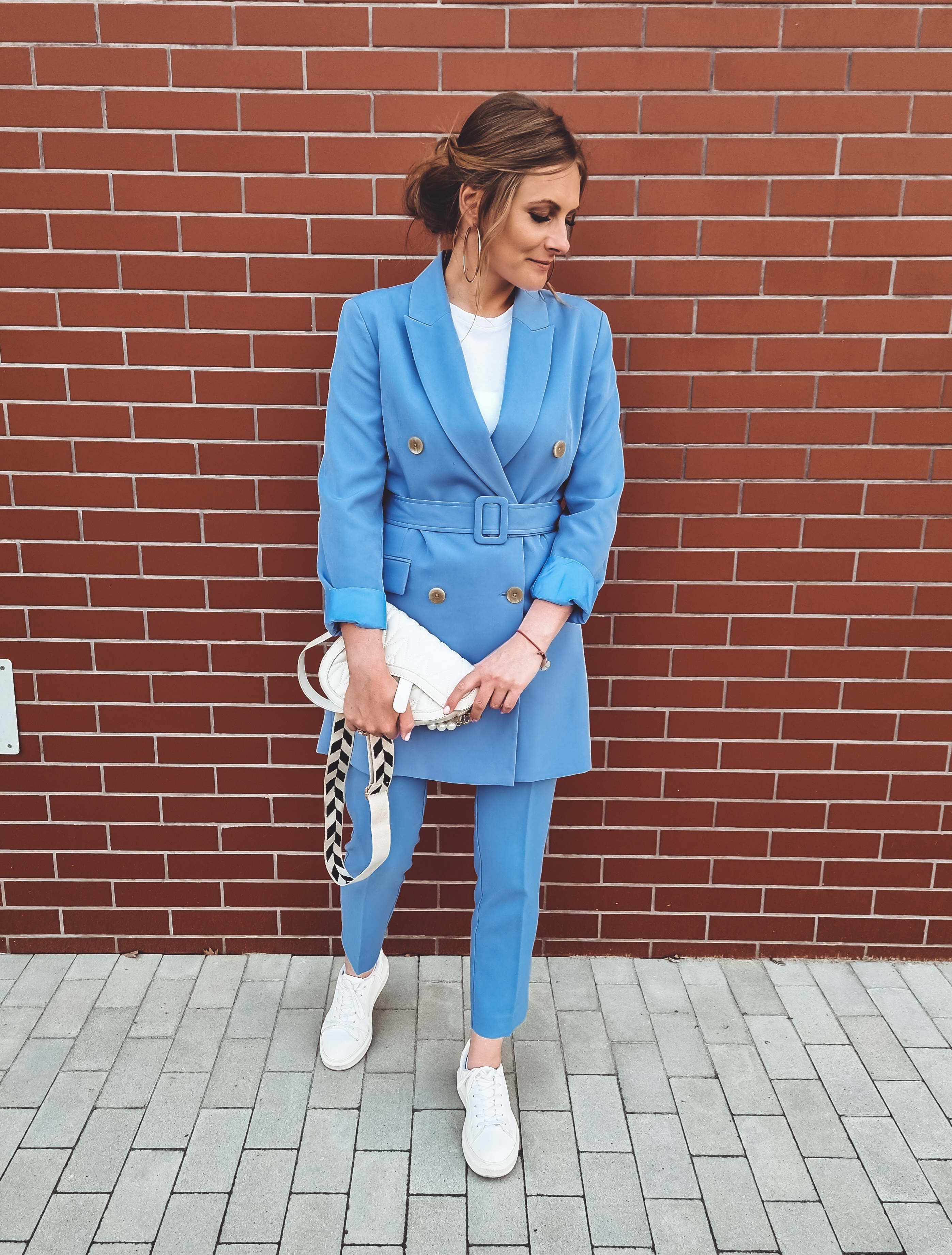 Tym razem biały klasyk czyli t-shirt i sneakersy z taliowanym garniturem, którego marynarka stanowi również odrębny byt jako sukienka. Z tego co pamiętam pojawiło się z nią tu kilka stylizacji sukienkowych już jakiś czas temu.